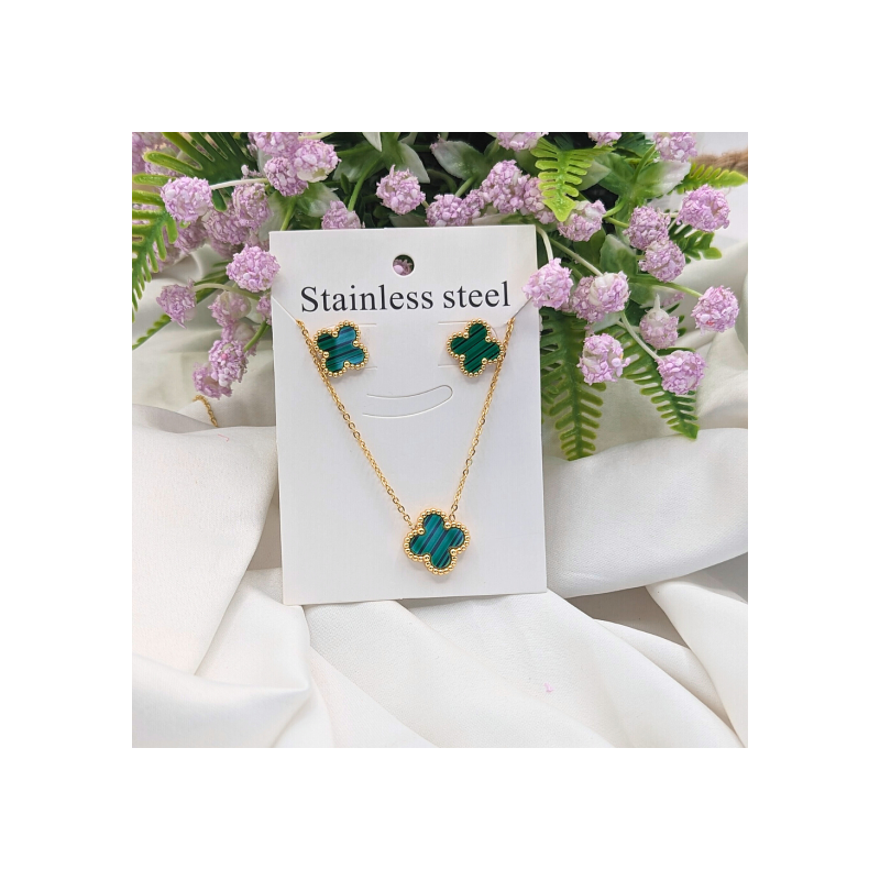 Ensemble chaîne + Boucle d'oreille trèfle vert 1